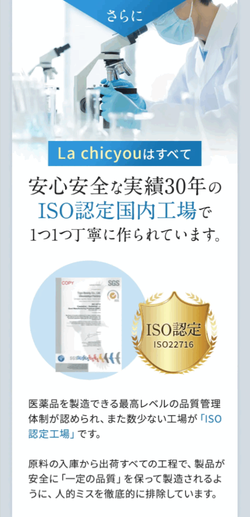ラシックユー アイラッシュセラム プラスは、品質管理体制が厳格なISO認定工場で製造されています。