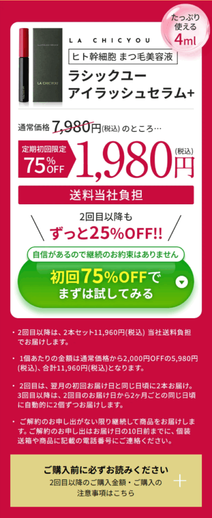 ラシックユー アイラッシュセラムプラス公式サイトからの購入ですね。今なら初回定期購入で価格は通常の約75%OFF、1,980円(税込)・送料無料で始められます。
